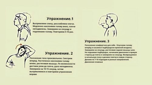 Для шеи подойдут наклоны и повороты головы во все стороны. Делайте их не только вперёд-назад, но и вправо-вниз, влево-вниз — так растягиваются боковые мышцы.