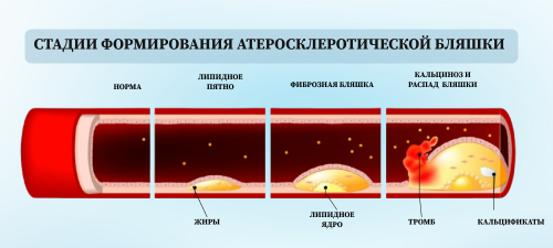 Особенность болезни в том, что развивается она постепенно и зачастую никак себя не проявляет. Более того, первые изменения могут начаться ещё в детстве, а серьёзные осложнения дают о себе знать уже во взрослом возрасте. Холестериновые бляшки ведут себя как плотина — перекрывают ток крови. Сначала это вызывает нехватку питательных веществ и кислорода, а затем приводит к некрозу тканей.