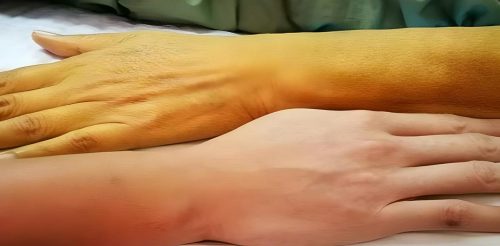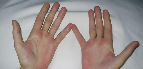 Характерное покраснение мизинцев и больших пальцев рук при бледной середине ладони. Оно возникает из-за неполного распада эстрогенов и приводит к расширению сосудов. Такие «печёночные ладони» встречаются практически при любых серьёзных поражениях печени.