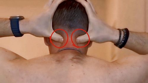 Поверните голову в сторону и нащупайте длинную мышцу, тянущуюся от затылка к ключице. Проведите по ней пальцами сверху вниз лёгкими движениями, затем повторите с другой стороны.