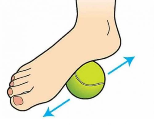 Можно использовать валик, бутылку или массажный мяч. Я предпочитаю теннисный — он доступен и удобен. Прокатка снимает перенапряжение со стоп, а вместе с ним уменьшаются боли в коленях, спине и шее. Именно чрезмерное напряжение стоп часто приводит к морщинам на лбу, отёкам под глазами и нависанию век.