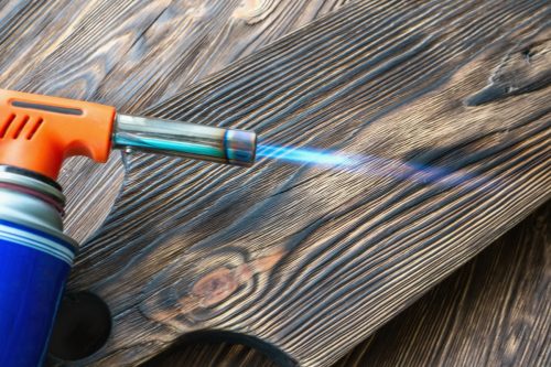 Когда древесина достаточно просушена, её прокаливают над пламенем. Это самый ответственный этап: нужно добиться лёгкого обугливания поверхности, не разрушая структуру дерева. Обычно держат доску на расстоянии 5–7 миллиметров от пламени — так образуется тонкий защитный слой. Я сам использую для этого обычную газовую горелку: ровно, быстро и без копоти.