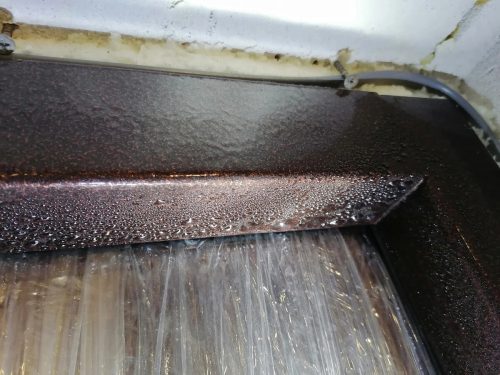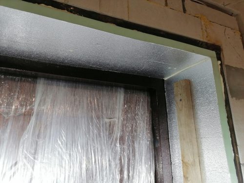 На фотографиях видно, как буквально через несколько минут после подачи питания влага на металле начинает испаряться. После монтажа откосы я закрыл PIR-панелями, приклеенными на клей-пену.