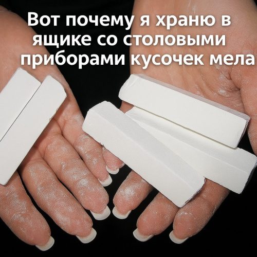 Чтобы ложки, вилки и ножи из серебра или мельхиора дольше оставались блестящими, положи в ящик с ними пару кусочков мела. Он защитит металл от влаги и помутнения.