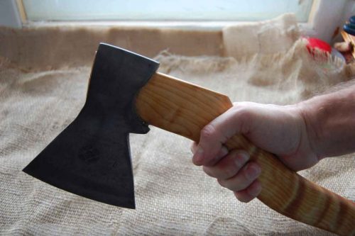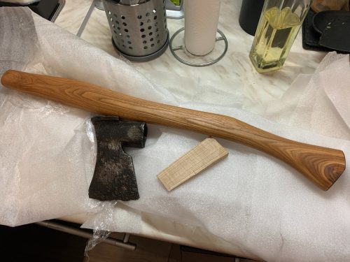 Теперь переходим к закреплению. На торце топорища делают три пропила: один продольный и два поперечных. Их глубина должна доходить почти до линии, где сидит головка, но не полностью. Затем насаживаем топор, аккуратно ударяя по тыльной части рукояти, пока он не «сядет» максимально плотно. Клинья желательно предварительно смазать эпоксидной смолой или столярным клеем, чтобы обеспечить дополнительную фиксацию. Сначала вбиваем продольный клин, затем два поперечных. Излишки аккуратно спиливаем, а поверхность торца зачищаем наждачной бумагой.