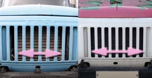 Радіатори теж різнилися за розміром. У ГАЗ-52 він менший, тому на решітці видно чотири незаповнені прорізи, а у ГАЗ-53 лише дві.