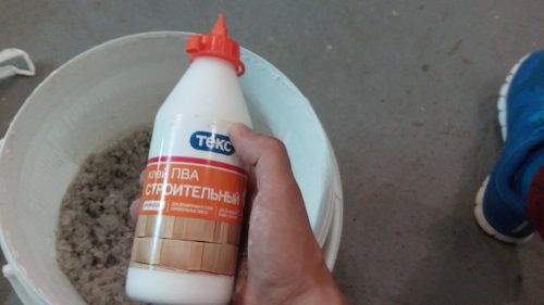 Клей ПВА делает смесь эластичнее, усиливает сцепление между слоями и предотвращает отслаивание покрытия. Главное — применять не обычный школьный, а строительный вариант с маркировкой «ПВА-МБ». В нём содержится больше поливинилацетата, что значительно повышает прочность готового раствора.