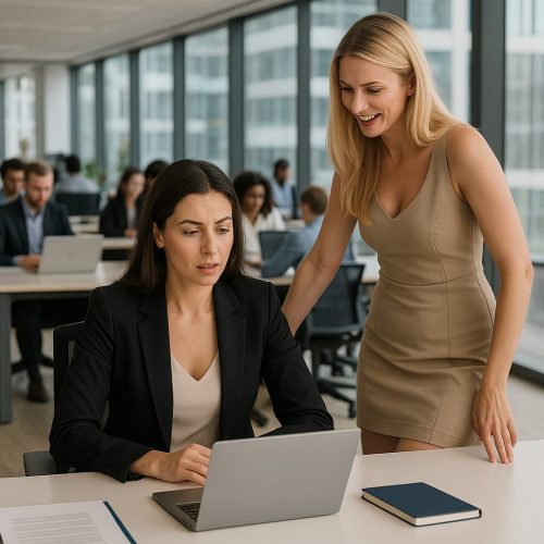 — Туалети тут миєш? — з насмішкою кинула Вікторія, зупиняючись біля мого столу. Її голос — гучний, демонстративний — розлився офісом, на мить змусивши завмерти навіть стукіт клавіатур.