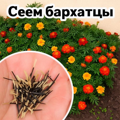 Одним из самых удачных вариантов являются бархатцы (чёрнобривцы). Эти неприхотливые цветы не только украсят участок, но и послужат природной защитой от вредителей, оберегая соседние растения. Посеянные под зиму, бархатцы начинают цвести уже весной и радуют глаз до самых холодов.