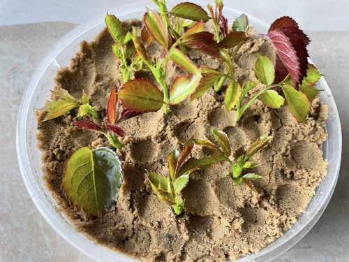 Если укоренение проводилось в конце лета, то зимой такие молодые розы лучше держать в прохладном месте — в погребе либо под лёгким укрытием: под ящиком, поверх которого уложено несколько слоёв спанбонда.