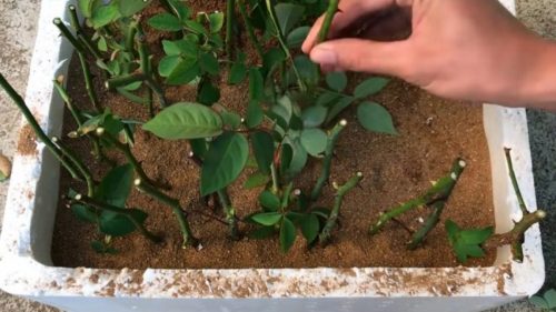 Наполняете ящик влажным песком, вставляете черенки под наклоном. Накрываете мешковиной или крышкой с отверстиями — воздух должен поступать.