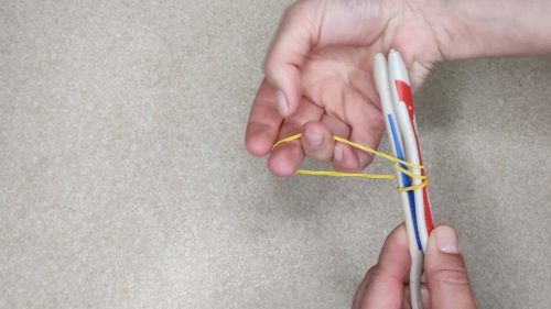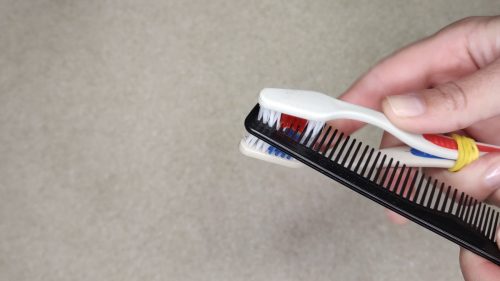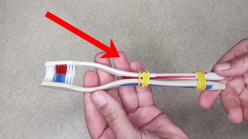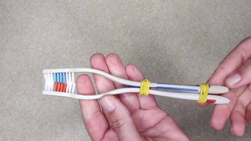 Итак, возьмите несколько канцелярских резинок и соедините две зубные щётки вместе, параллельно, с небольшой плотностью прижима.