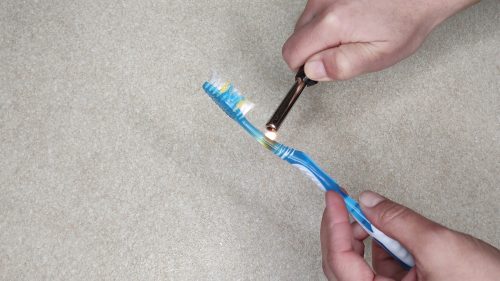 Следующий трюк — действительно полезный. Возьмите зажигалку и прогревайте щётку примерно 15 секунд в области между головкой с щетиной и серединой ручки. Заметьте, что я беру щётку, которую не жалко выбросить позже — думаю, вы тоже поступите так же.