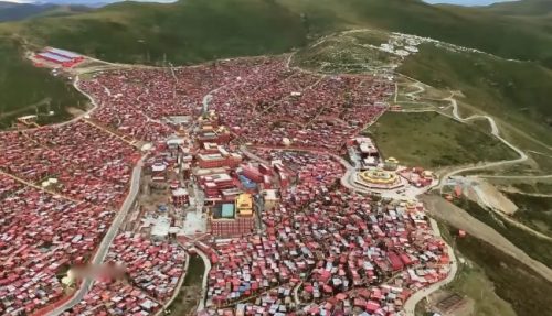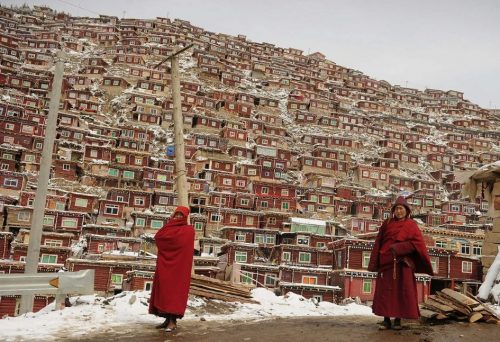 На высоте примерно четырёх тысяч метров расположился крупнейший буддийский учебный комплекс на Земле. Десять тысяч мини-домиков, красных как кирпич, опоясывают склон горы, словно разбросанные карликовые домики из кассовой игрушки.