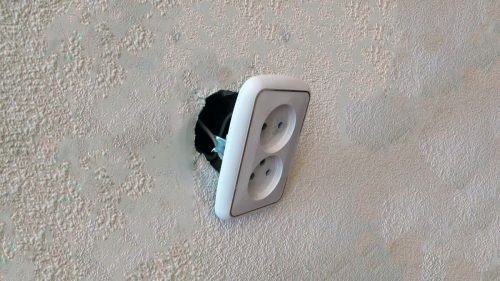 Особенно часто подобное наблюдается в старых панельных домах, где стояли розетки старого образца, установленные прямо в отверстия в бетоне, без полноценных монтажных коробок. Даже если розетка полностью не выскочила, то при подключении приборов она заметно люфтит, явно не удерживается как следует в посадочном месте.