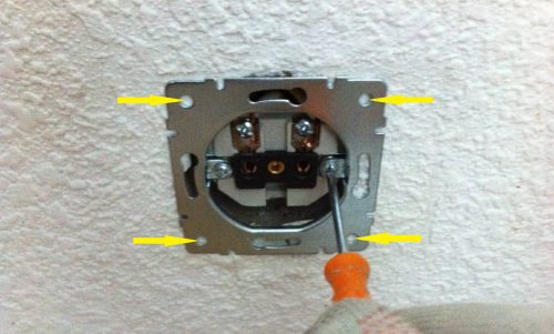 Если же розетку нужно просто надёжно закрепить, не устраивая полную реконструкцию — можно поступить значительно проще. Если розетка имеет внешнюю декоративную рамку, достаточно отключить электричество в щитке, наметить точки крепления, просверлить небольшие отверстия под дюбели (даже 4 мм вполне хватит), после чего прикрутить розетку непосредственно к стене. Главное — не раскрошить посадочное отверстие.
