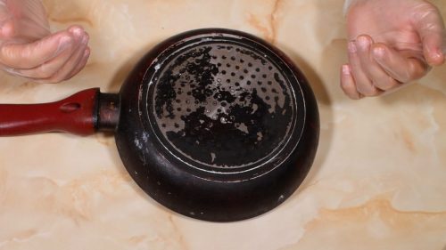 Важно! У сковородок с антипригарным покрытием есть нюанс: держать их в контакте с аммиаком дольше часа ни в коем случае нельзя. В противном случае нашатырный спирт начнёт разрушать не только нагар, но и само антипригарное покрытие, что может безвозвратно испортить посуду.