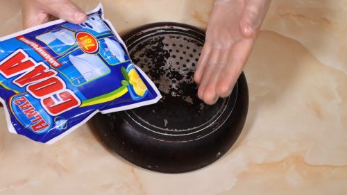 Если слой нагара тонкий, убрать его легко и без неприятных запахов. Мне понадобится кальцинированная сода — у меня она с солью в составе.
