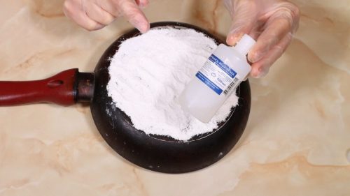 Я равномерно посыпаю ею дно сковороды. Затем аккуратно распределяю по поверхности перекись водорода так, чтобы смесь превратилась в вязкую пасту.