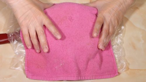 Точно так же распределяю слой кальцинированной соды по всей поверхности, а сверху добавляю нашатырный спирт. Затем накрываю салфеткой, сверху — полиэтиленовым пакетом, а после — тряпкой. Тогда запах становится значительно менее выраженным.