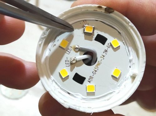 Теперь можно подключить лампу — она будет светить очень тускло. Далее внимательно рассматриваем диоды один за другим. Неполадка видна сразу: на испорченном элементе обычно заметна тёмная точка. Именно этот диод разрывает цепь.