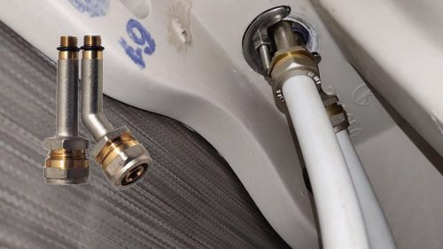 вместо шлангов — металлопластик 16 мм и специальная вкрутка (прямая или под углом). Она отделяет смеситель от трубы и делает соединение монолитным.