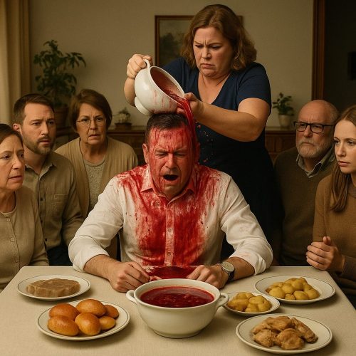 Сміх рвонув так, ніби грім ударив прямісінько в кухню. Сміялися всі. Сміялися не зло — а з полегшенням, наче з їхніх плечей нарешті зняли якусь брилищу. Сміялися з абсурдності ситуації, з пафосного індика, який хвилину тому повчав усіх, а тепер стояв увесь у борщі, кліпаючи червоними від буряка віями.