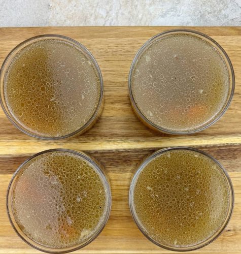 Первый бульон обязательно сливаю — так уходит лишний жир и возможные примеси. Затем снова наливаю чистую воду, кладу целые луковицы и разрезанную морковь, убавляю огонь до минимума и оставляю томиться на пять–шесть часов, не допуская активного кипения.