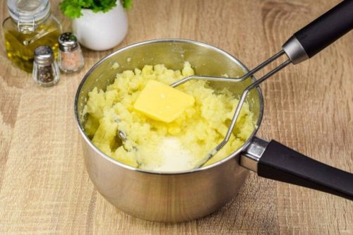 Чтобы пюре не приобрело сероватый оттенок и осталось нежным, не стоит добавлять холодное молоко. Его лучше заранее подогреть, растопив в нём кусочек сливочного масла. Тёплую молочно-масляную смесь нужно вводить постепенно, продолжая разминать картофель. Альтернативный вариант — использовать сметану вместе с маслом, если нравится более насыщенный вкус.