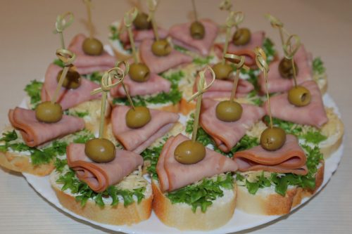Канапе на хлебе с ветчиной, сыром и оливками