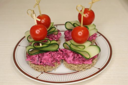 Свёклу и сыр натрите мелко, яблоко — крупно. Смешайте с солью, майонезом и чесноком. Огурец нарежьте длинными слайсами (овощечисткой). Из хлеба вырежьте кружочки, положите начинку. На шпажку: черри, затем «змейкой» огурец, проткните основу.