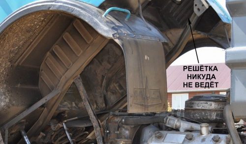 Якщо замислитися логічно, радіатор охолодження на МАЗі розташований спереду, відповідно й основна решітка радіатора знаходиться між бампером і лобовим склом. Крім того, всередині кабіни під передньою панеллю по центру встановлений обігрівач. У зв’язку з цим виникає цілком резонне запитання: навіщо тоді потрібна ця бокова решітка, якщо вона не має очевидного функціонального призначення?