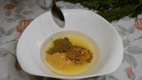 Теперь готовим маринад. В миску выжимаю сок половины лимона, добавляю чайную ложку сахара, вливаю растительное масло. Затем кладу по две чайные ложки русской и дижонской горчицы в зёрнах, а также половину чайной ложки молотого кориандра — сочетание кориандра с рыбой мне особенно нравится.