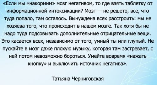Ещё один действенный способ — ведение дневника. Причем вовсе не обязательно подробно описывать каждый прожитый день. Можно подойти к этому творчески: записывать афоризмы, мысли известных людей или короткие фразы, которые стали для вас личным девизом на сегодня. У Татьяны Черниговской, например, есть свой взгляд на избавление от негатива: