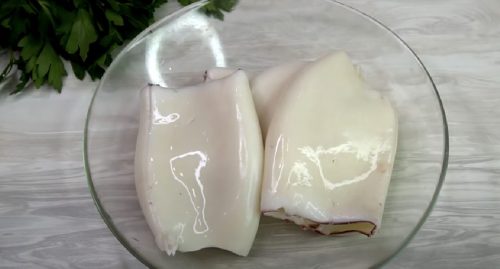 Начинаем с кальмаров. Воду доводим до активного кипения, опускаем хорошо промытые и очищенные тушки. С момента погружения засекаем ровно одну минуту, затем сразу вынимаем и перекладываем в холодную воду, чтобы остановить термообработку. После этого ещё раз промываем, снимаем плёнку и нарезаем кальмары тонкой соломкой. Вес готового продукта — около 300 граммов.