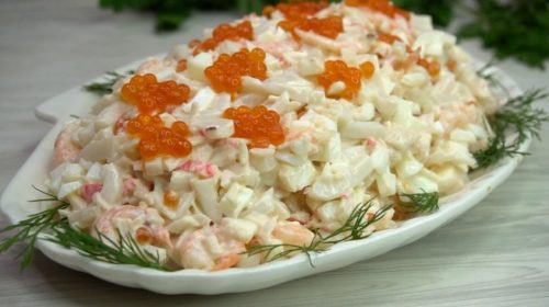 Этот салат — настоящая находка для праздничного стола. Он нарядный, не требует сложных кулинарных приёмов и всегда получается сбалансированным по вкусу. Проверено: даже те, кто обычно равнодушен к морепродуктам, просят добавку.