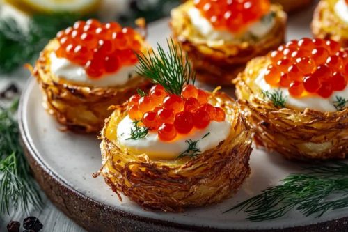 Две картофелины натрите на тёрке для корейской моркови, отожмите сок, добавьте ложку крахмала и щепотку соли. Разложите массу по формочкам для маффинов, формируя «гнёзда». Запекайте при 200 °C около 20–25 минут до румяной корочки. Для крема смешайте 200 г творожного сыра со сметаной, добавьте лимонную цедру и укроп. Наполните остывшие корзиночки кремом и выложите сверху икру.