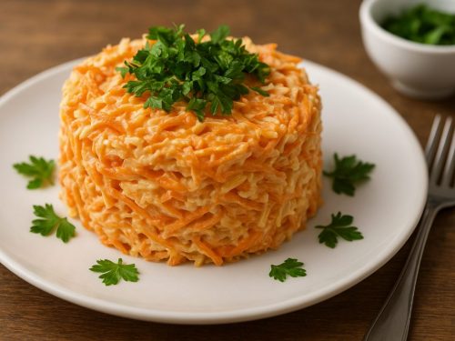 Когда требуется в считанные минуты приготовить блюдо, которое будет выглядеть эффектно, радовать вкусом и хорошо насыщать, салат «Лисичка» выручает безотказно. В нём гармонично сочетаются мягкое куриное мясо, выразительная морковь по-корейски и приятные сырные оттенки. Если продукты подготовлены заранее, на всё уходит не больше четверти часа. Салат получается ярким, аппетитным и уместным как на будничном столе, так и на праздничном застолье, при этом его с удовольствием едят и взрослые, и дети.