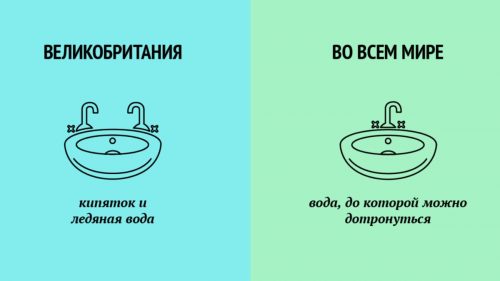 Быт в Великобритании во многом непривычен для жителей постсоветского пространства. Здесь левостороннее движение, окна чаще распахиваются наружу, а у входа в дом почти всегда стоит мусорный контейнер на колёсах. Но больше всего недоумения у приезжих вызывает местная система водоснабжения. В большинстве домов в раковинах установлены не смесители, а два отдельных крана — один с холодной, другой с горячей водой.