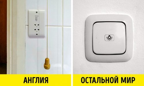 В ванной комнате английского дома можно заметить ещё одну особенность — отсутствие привычного выключателя на стене. Вместо него с потолка у двери свисает шнурок. Потянул — свет включился, потянул ещё раз — выключился.