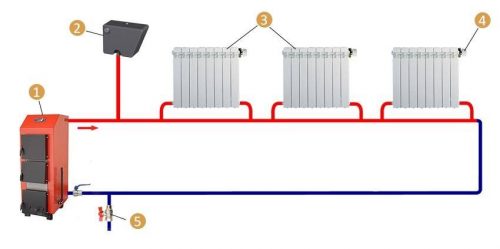 Схема обычно выглядит так: 1 — котел, 2 – расширительный бак, 3 — радиаторы, 4 – кран Маевского для стравливания воздуха.