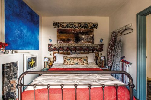 Хозяйская спальня оформлена обоями в духе XVIII века от Hamilton Weston. Шторы сшиты из антикварного ситца, а комод, купленный на eBay, служит местом хранения постельного белья и одежды для сна. Ещё одну маленькую комнату переоборудовали в гардеробную — вся одежда размещается в большом расписном шкафу, приобретённом у антиквара в Италии.