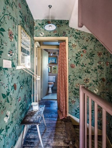 Коридор оклеен обоями французского бренда Pierre Frey из стопроцентного льна. Они невероятно дорогие, и Либби признаётся, что пока копит средства, чтобы оформить ими остальные комнаты. На антикварном табурете стоит культовая лампа Tizio 1970-х годов.