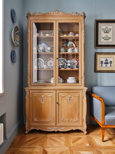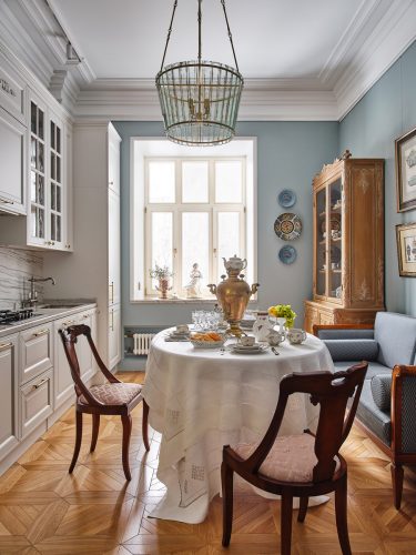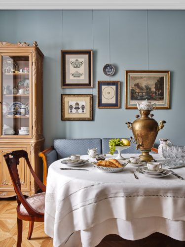 Скатерть с игольчатым кружевом выполнена на фабрике «Крестецкая Строчка», работающей по традиционной технологии с XIX века. Медный самовар — подлинный, дореволюционный. Буфет, несмотря на винтажный вид, изготовлен в наши дни на итальянской фабрике. На полках — семейный фарфор, из которого хозяйка с удовольствием пьёт чай.