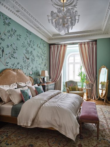 Одну из стен решили расписать вручную в стиле шинуазри — по желанию самой хозяйки. Как вспоминает дизайнер, Лариса Вениаминовна сказала: «Хочу просыпаться в саду». Так в спальне и появился сад.