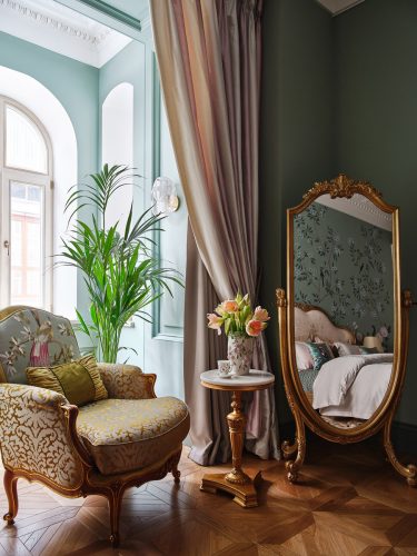 Ручная роспись смотрится роскошно и органично вписывается в общий стиль, подчёркивая его изысканность. Здесь же обустроен уютный уголок, где можно посидеть в тишине с чашкой кофе.