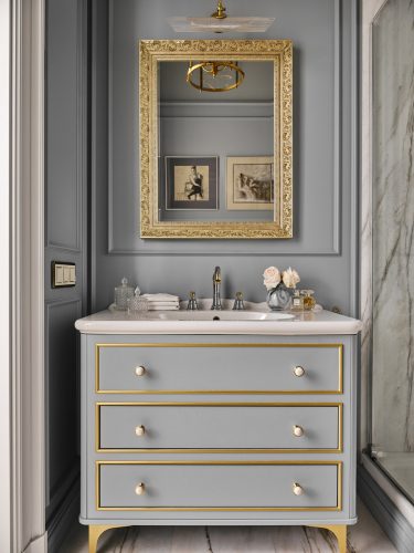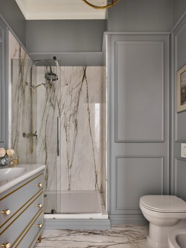 Справа от душевой скрыт шкаф, в котором размещены счётчики, бойлер и полки для бытовой химии. Он мастерски замаскирован и почти незаметен. Тумба под раковину изготовлена на заказ по эскизам дизайнера, а ручки выполнены из натурального камня — эстетика здесь продумана до мелочей.