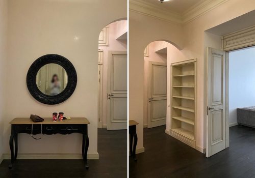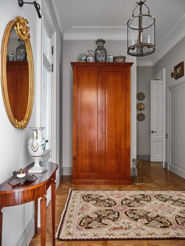 Завершает нашу экскурсию прихожая, главным украшением которой стал шкаф из массива дерева от интерьерного салона BAMAX. Для сравнения: сразу после покупки это пространство выглядело безлико и лишено характера. Сопоставляя фотографии «до» и «после», становится очевидно, что хозяйке и дизайнеру удалось вернуть квартире её исторический шик и неповторимую атмосферу.
