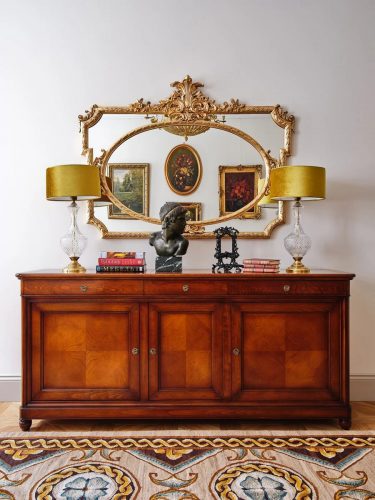 Для настольной лампы подобрали другой абажур, чтобы она гармонировала с насыщенным характером гостиной. Комод, светильники и зеркало — подлинный антиквариат.