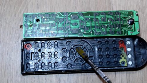 Решение простое. Я аккуратно разбирал пульт: сначала вынимал батарейки, затем откручивал винты, а корпус осторожно поддевал тонкой отвёрткой. После этого ватной палочкой, смоченной в спирте или растворителе, протирал плату, уделяя особое внимание контактным площадкам под кнопками. Загрязнение хорошо заметно — вата становится чёрной. Тем же способом очищал и сами кнопки с внутренней стороны.
